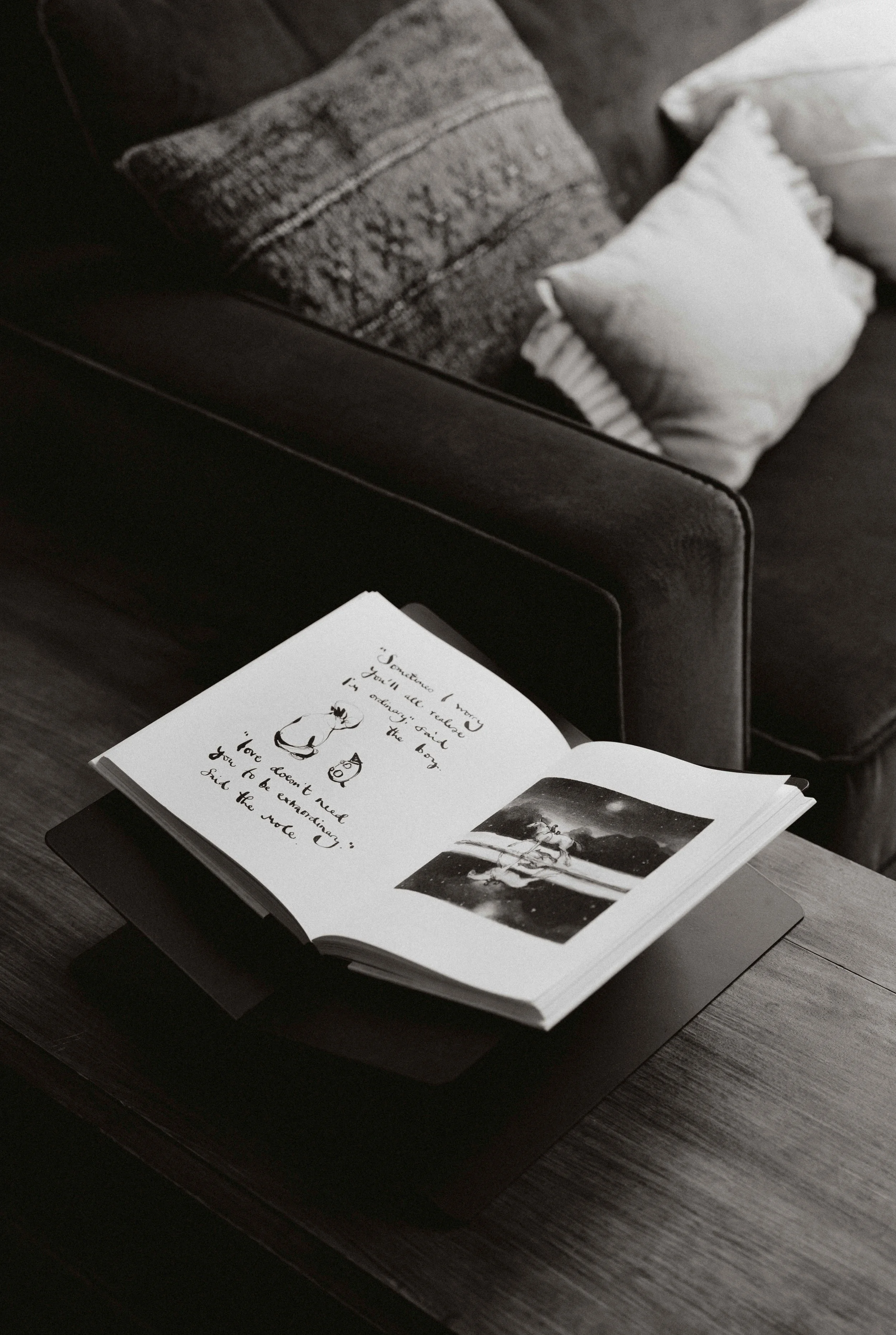 Even later gaat ze voor de bank zitten op de grond, met tijdschrift en een fotoalbum.