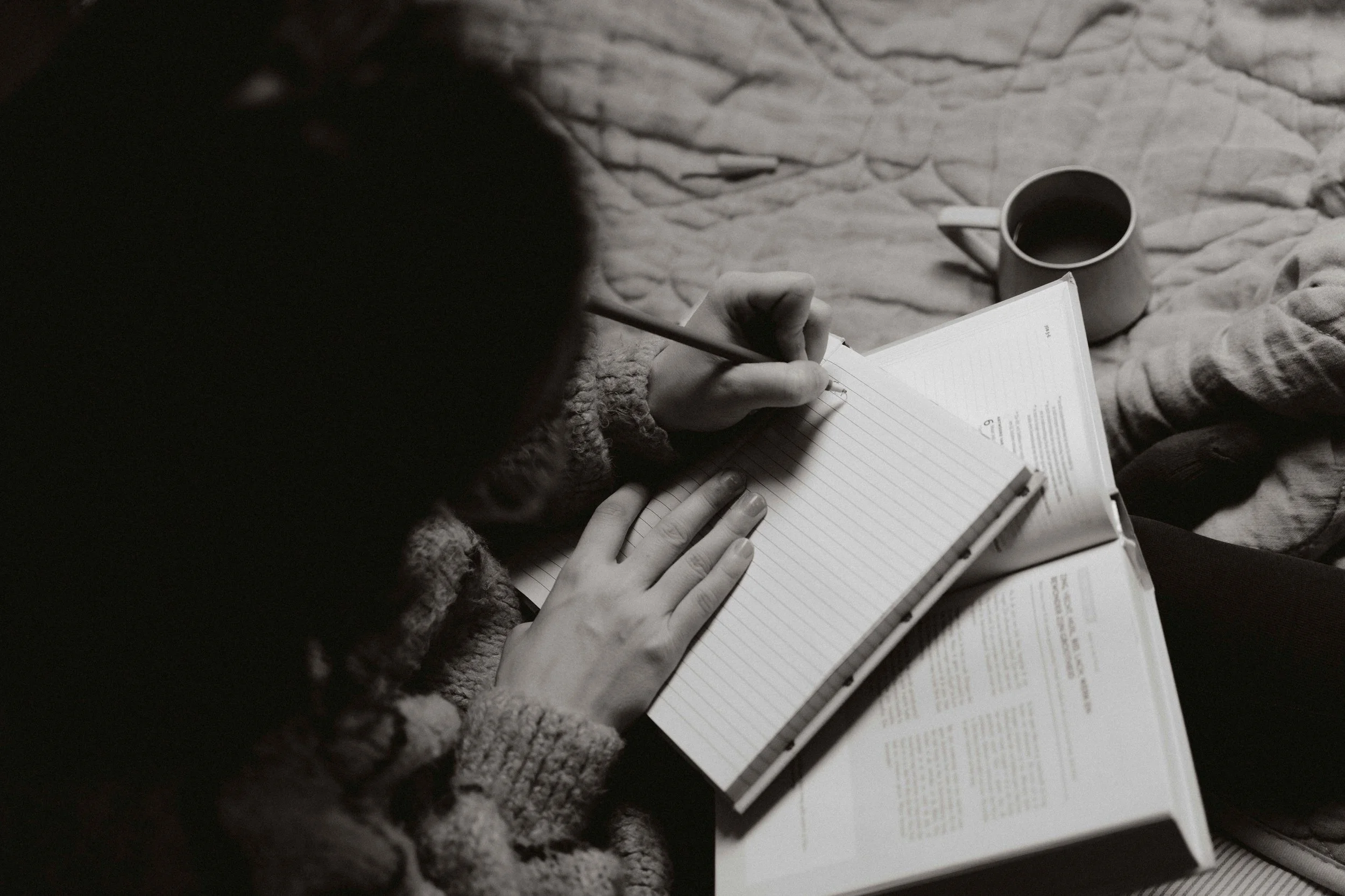 Eerst zet ze een kop thee, waarna ze op bed ploft. Bijbel open, notities erbij.